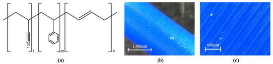 PC and ABS are similar in polarity, and might be compatible with each other in such a way that ABS will bind well with a PC print bed; the ABS-grafted rubber (butadiene) particle chains would remain insoluble, but bounded by their styrene acrylonitrile side-chains, producing effective physical properties with PC [54,58,59]. It is reasonable, therefore, to predict that a PC build plate will provide effective support for the printing of ABS at a low-to-medium level. Figure 7 shows the chemical structure of ABS, as well as the raw and processed surfaces of the material.