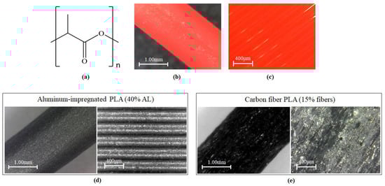 PLA (a) chemical structure; (b) raw material; and (c) final processed material; Aluminum-powder PLA (d) and carbon-fiber PLA (e) were special cases which were examined.