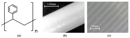 High impact polystyrene (HIPS) thermoplastic, commonly known as rubber-toughened polystyrene, was developed as a ductile alternative to the general-purpose polystyrene. HIPS is prepared by the thermal polymerization of styrene monomer with polybutadiene rubber. Its structure is composed of an amorphous polystyrene matrix containing a uniform dispersion of composite spheroid domains. HIPS polymer possesses some benefits over other inflexible plastics, particularly in the areas of flexibility, cracking resistance, and cost [71,72]. Polystyrene containing large rigid side groups of benzene rings is expected to be harder and more brittle, with higher tensile strength [69] (pp. 219–220). Figure 10 demonstrates the chemical structure, the raw filament form of the material and the final processed surface.