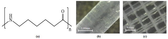 Nylon is the general name for synthetic polyamide, which is a linear polymer chain. Nylons are labeled by a numbering system designating the number of carbon atoms in the repeating unit [76,77]. Nylon is commonly used in engineering applications because of its appealing blend of noble mechanical properties and processability [78]. It is established that anionically-polymerized polyamide possesses a wide range of properties such as high melting temperatures, heat stability, mechanical strength and lightness, suitable fatigue and abrasion resistance [79]. One of nylon’s major weaknesses is its poor impact strength below its glass-transition temperature and in the dry state, high moisture absorption, poor dimensional stability and unsatisfactory heat deflection temperatures [79,80]. Figure 11 shows the chemical structure and examples of the raw and processed material.