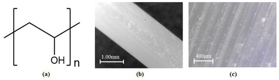 Some materials used to strengthen PVA include gold, silver, inorganic nanoparticles based on hydroxapatatite, and chitin whiskers. Also, cellulose fillers are commonly employed to strengthen PVA. Three hydroxyl groups supporting each D-glucose unit in cellulose chains contribute to the material’s high mechanical strength; each can form an inter-chain or intra-chain hydrogen bond. Because of the highly polar nature of PVA and its water solubility, it blends well with cellulose [88,89,90]. Polyvinyl alcohol has the lowest moisture permeability of any commercial polymer, but its water sensitivity has restricted its usage [91] (p. 18). It is not predicted to bond well with PC, as there is no obvious chemical reaction that could initialize bonding. Figure 13 shows the basic chemical structure of PVA, as well as examples of raw and processed materials.
