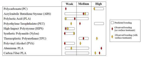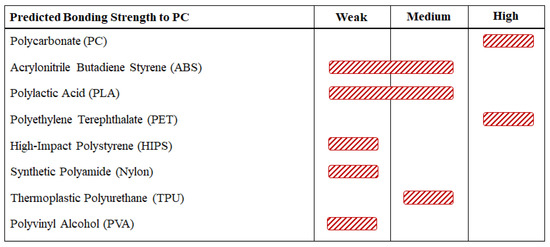 To aid in the understanding of how an AL-PC print bed may behave for printing the 10 materials under study, a detailed review was conducted to analyze the properties of these materials. The uses, mechanical properties, chemical mechanisms, and potential to chemically bond with polycarbonate were all examined from the existing literature. From this information, predictions were made about the printability of each material in the PC plates. This section contains the discussion, the predictions, and descriptions of the materials. The relevant material properties, both bulk and printed (when available in the literature), for each are shown in Appendix A for the benefit of the reader. The bonding predictions of each material were defined according to a weak–medium–high system, based upon the ease of removing the part from the bed after printing. The definitions are: