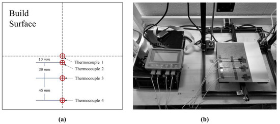 The first experiment was designed to test the heat loss through the aluminum build plate and the heat loss through the composite of the two materials, as well as the same for a similar glass-aluminum composite. The heat loss measured is that between the aluminum plate and the top of the PC sheet where the part would be built. Figure 15 demonstrates the setup of the experiment, which was carried out in four parts. In Part (1), a heated aluminum 3-D printer build plate was set up with a series of K-type thermocouples set at varying distances from the center, as shown in Figure 15. The purpose of this was to detect any surface temperature inconsistencies in the plate while measuring the heating performance (no such gradients were noted in the analysis of the data). All the thermocouples measured the heat loss across the plate and the distribution of the thermocouples ensured that the measurements were consistent in different areas of the plate. Note that the surface was covered with painter’s tape in the locations of the thermocouples in order to prevent them from shorting out on the metal bed.