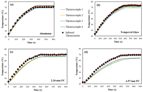Heat loss experiment results, where (a) indicates the results for the bare aluminum plate, while (b–d) show the results for the glass and the two PC plates, respectively.