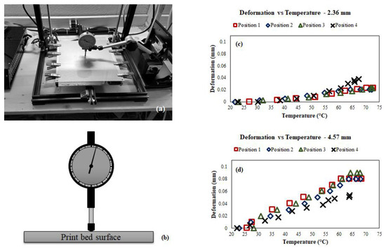 To test the deflection and warping behavior in the polycarbonate plates, an experiment was designed and run. Similar to the experiment in Section 4.1, an AL-PC build plate was set up on the heated bed of a 3-D printer and the thermal cycle was run. The deflection was measured via a precise dial gauge in the same locations as the thermocouples were previously placed (Figure 15). Figure 17a,b shows the experimental setup. Readings of the dial indicator were taken every 60 s for a total of 600 s. All cases reached steady state at the 70 °C set temperature by that time and stopped expanding noticeably. As in the heat loss experiment, two different thicknesses of polycarbonate sheet (2.36 mm and 4.56 mm) were used. The results are shown in Figure 17c,d.
