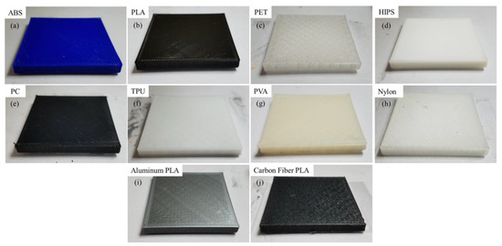There are several different extruders and build plate configurations available for FDM, primarily based on the need to process specific materials. For example, high-warp materials require an enclosed frame with a controlled environment, while low-warp material materials can be processed in the open air [6,7,8,9]. Abrasive materials may require hardened extruder components [10,11], while very soft materials may require an extruder that is slow and supports the filament to prevent buckling [12,13,14]. There are scores of materials and material blends that can be processed using FDM, so understanding the correct processing parameters for the chosen materials is very important [3,4,5]. To this end, the present study analyzed 10 different polymer materials that can be used in a wide variety of engineering disciplines, summarized in Table 1 below. Further analysis of these materials and their uses is presented in Section 3.