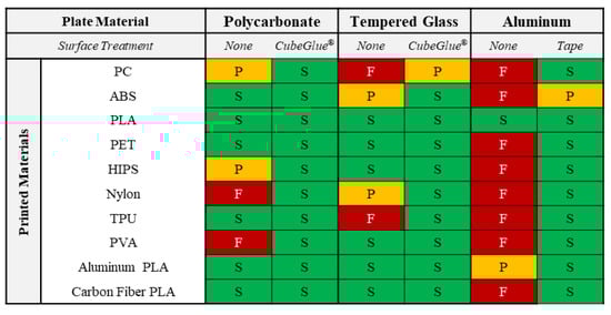 Some proprietary solutions are used as well, often appended to the glass or aluminum print beds; these typically consist of various coatings that can be added to the print bed [19,20,32,33,34], but also include various composites made from fiberglass or acrylics [34,35]. However, all of these solutions are in themselves limited in the materials or build size that they can accommodate, are often single-use, and can be costly. The authors have extensive experience with many of these technologies, including those not discussed in the AM literature, and have found that none of them work well outside a fairly narrow range of use. For the hobbyist interested in printing a small number of materials and limited print sizes, most or all these options are helpful.