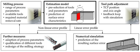 The approach is specifically aimed towards the machining of structural components for aerospace applications, which usually includes a high proportion of pocket milling, a great number of stiffening ribs with low wall-thicknesses, and strict requirements regarding tolerance specifications as well as manufacturing time. The estimation model is used to analyze a given milling process that leads to intolerable surface errors. The surface-error characteristics are predicted based on the available range of process parameters and qualified tools. Subsequently, process setups leading to surface errors that can be described in a good approximation by a linear error profile are selected. The exact surface error is determined using a numerical simulation that allows for the calculation of the adapted tool path. If no parameter setup that satisfies the criterion of a nearly-linear error profile can be found, the required tool-path adjustments are assumed to be too complex for a cost-effective compensation. This early evaluation helps to avoid costly numerical modeling and time-consuming simulation runs. In that case, further measures must be taken, ranging from the qualification of different tool geometries and the minimization of workpiece deformation via the adaptation of process parameters up to a redesign of the entire milling strategy.