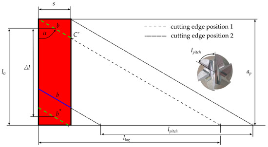 Figure 3 shows the “uncoiled” idealized contact zone of the machined workpiece surface. The dashed lines represent the “uncoiled” cutting edges of the end mill at two different points in time. For the derivation of the model equations, the influence of tool and workpiece deflections on the geometric relations are neglected, and it is assumed that no tool runout is present. In practice, the tool immersion angle and the length of the contact lines continuously change due to the above-mentioned effects. The influence of this simplification on the prediction accuracy of the proposed model will be discussed in Section 4.