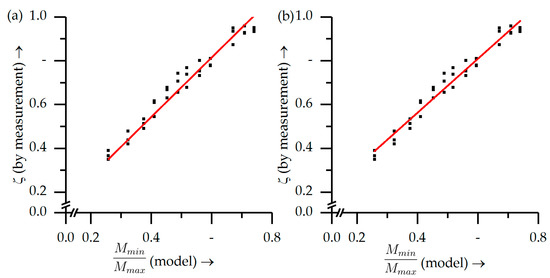 The model was validated by comparing the error linearity factor determined via measurement with the fictitious moment ratio derived from the model. In order to calculate in Equation (1), the surface profile in the middle of the plates was analyzed regarding the maximal deviation and deviation at the top edge from the nominal dimension (Figure 2b). The fictitious bending moments were calculated following Equations (2)–(18). Using a linear regression model, Equation (19) was confirmed: A directly proportional relation (Figure 4a) yielded a marginally larger error compared to the linear fit (Figure 4b), as shown in Table 2. The experimental results also confirmed the assumption that the feed per tooth did not directly influence the error linearity factor . The divergence in the measurement values with varying laid within the range of repeat measurements with identical parameters. However, the absolute values of the dimensional deviation were higher with increasing feed per tooth . The maximal measured deviations among the workpieces ranged from 46 to 332 . In Figure 4, all data point triplets are comprised of one value for each , which cover the spread of all measured values.