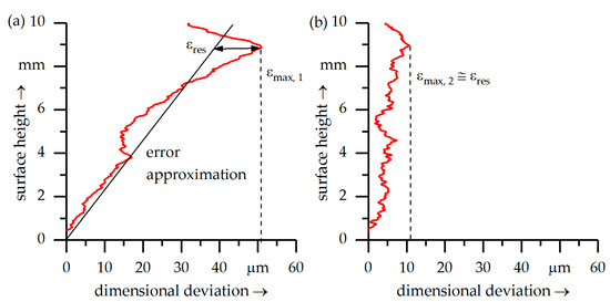 Figure 5b depicts the error profile of a workpiece that was machined with identical process parameters as the workpiece shown in Figure 5a while applying the experimentally determined tool path adjustment. In doing so, the maximal surface error was reduced by about 80%, which falls in line with the estimation from Equation (21). Adjusting the angle of attack also changes the effective cutting width towards the top edge of the workpiece. In case of large surface errors, this effect becomes quite significant and the error mitigation less effective. When using a process simulation, the issue is addressed by iteratively modifying the effective cutting width within a feedback loop.
