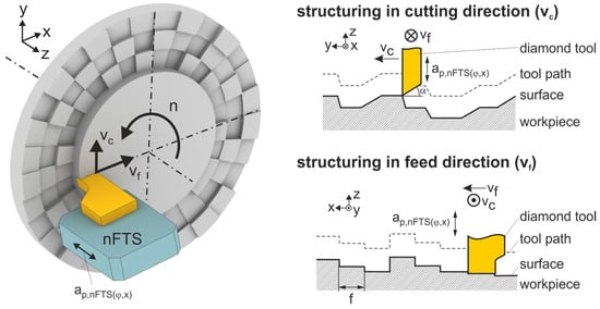 The manufacturing process is based on a face turning process. In order to generate defined structures on the workpiece surface, the process kinematics have to be chosen specifically. The diamond tools have a rectangular shape and tool widths of 10 and 20 μm, respectively. The principle cutting process is superimposed by the nFTS normal motion.