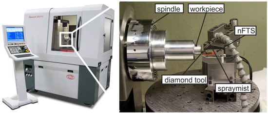The cutting experiments were conducted on a Nanotech 350FG ultra precision machine tool, situated in a temperature-controlled environment, stabilized to 20 ± 0.1 °C with a constant humidity of 50 ± 5% (cf. Figure 2). For lubrication and chip removal, the machine was equipped with an oil spray mist. The underlying processing type was a face turning process, and the air bearing main spindle ran in spindle mode with 100 rpm.