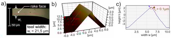 The rectangular shaped diamond tools for structuring have widths from 10 to 20 μm; the characteristics of the diamond tools are summarized in Table 1. In order to choose a feed in accordance to the tool width wt, the tools were inspected by a light microscope (cf. Figure 3a). The cutting edge was measured by an atomic force microscope (AFM) before the experiments and showed a cutting edge radius of 0.1 μm (cf. Figure 3b,c).