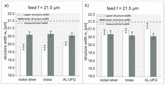 Influence of the material on the structure width (a) with a feed of f = 21.0 μm and (b) with a feed of f = 21.5μm.