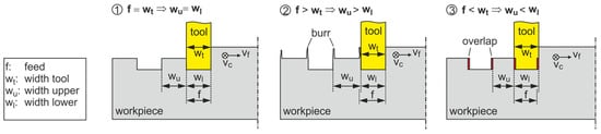 In order to prevent burr formation, for the initial experiments, the feed was 0.5 μm smaller than the measured tool width. As this leads to unequal structure sizes (cf. Figure 4a), the experiments were repeated with a feed f = 21.5 μm = wt, so that the feed matched the tool width (cf. Figure 4b). It can be seen that the upper structure width is approximately equal for both feeds. This suggests that the actual tool width might have been slightly smaller than measured with the white light microscope. Comparing the two graphics in Figure 4 with respect to the upper structure width, it can be noted that the structure width is about 1 μm smaller for the smaller feed f = 21.0 μm. This observation can be explained with the difference in feed. A feed that is too small will cause an overlap of the machining paths (cf. Figure 5(③)). Thus, the upper structure elements are affected but at each side of the structure element, which explains the difference of about one micrometer.