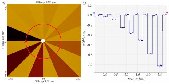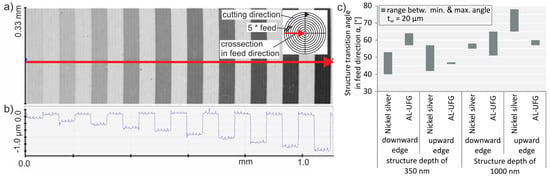 To determine the structure transition in the cutting direction, a defined alternation of the structure depth was carried out in the cutting direction, dependent on an angular position of the spindle (cf. Figure 6a). In this way, a Siemens star-like pattern with 16 sections was generated. Each measurement was repeated at different positions at the same area for statistical validation.