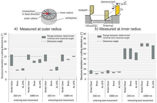 Structure transition angle in the cutting direction measured for all materials at (a) the outer radius of the workpiece and (b) the inner radius of the workpiece.