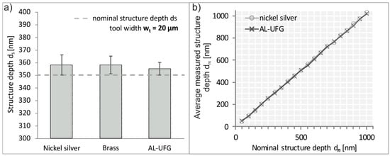 The measured structure depth of these structures is described in Figure 9. For the measurement of the structure depth, measurements from all types of structures were evaluated by a white light interferometer. The results are shown in Figure 9. In this investigation, no impact of the material on the generated structure depth was determined. Since the structure depth is mainly affected by the positioning accuracy of the nFTS, which generates the depth of cut, this result was expected. In Figure 9b, the average measured structure depth against the nominal structure depth is shown for nickel silver and ultrafine-grained aluminum, which again shows no impact of the material.
