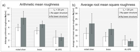Another phenomenon apparent in Figure 10 is the difference of the surface roughness for the upper and lower structure elements, where lower structure elements showed, in general, roughness values higher than those of the upper structure elements. This effect is only detected for nickel silver and brass, but in both roughness parameters. This suggests an impact of the structure depth on the surface roughness, which can be explained by the higher amount of removed material as well as the higher cutting forces that accompany the higher depth of cut.