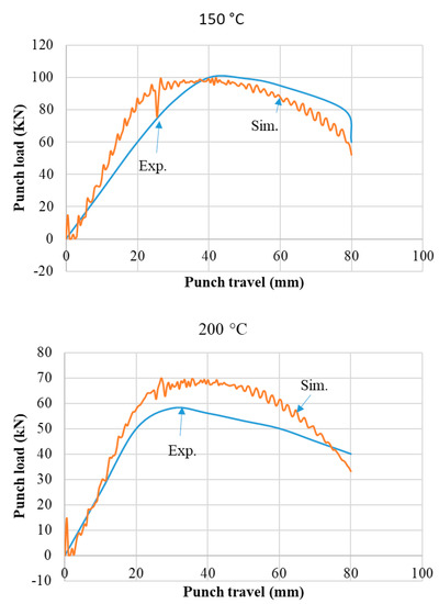 In this study, cup drawing at four different temperatures of sheet blank/die/blank holder namely 150, 200, 250, and 300 °C—were simulated. The initial punch temperature was assumed to be 25 °C. The finite element models were first validated by comparing the calculated temperature distribution, punch load, and thickness distribution on the formed cups with the experimental measurements. Then, the Z-FLS in Figure 4 was used to predict fracture and determine the LDRs of the numerically formed cups.