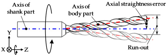 With the development of high-density printed circuit boards (PCBs) [1,2], there is an increasing demand for the microdrilling of precision holes. Compared with laser drilling [3,4] and electrochemical drilling [5,6], mechanical drilling is the most useful machining method for high aspect ratio microdrilling in practice, because it can process a variety of materials with finer quality at lower cost [7,8,9,10]. To satisfy the requirement of high aspect ratio microdrilling on the PCBs, efforts have been devoted to designing and manufacturing microdrill bits with large aspect ratios [9,10,11,12,13,14]. Due to the large aspect ratio and the low rigidity of the microdrill bit, an axial straightness error between the shank part and the body part is very likely to occur, even when manufactured by using ultra-precision grinding tools. As shown in Figure 1, when the microdrill bit is being rotated, the run-out caused by the axial straightness error is generated at the end point of the microdrill bit. The run-out of the microdrill bit would lead to an enlargement of the diameter of the drilled hole [15] and the occurrence of burrs around the hole [16], consequently reducing the hole quality in the PCBs drilling [17]. For the quality control of both PCBs drilling and microdrill bit processing, it is desired to precisely measure the degree of the run-out of the microdrill bit.