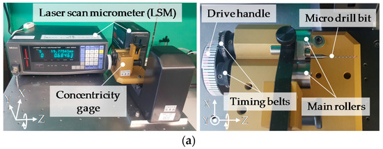 Figure 2 shows photographs and the schematics of the laser scan micrometer measurement system. The measurement system is composed of the concentricity gauge and the LSM. The shank part of the microdrill bit is gripped by the two main rollers and the top roller. Two timing belts connect the shaft of the drive handle and the shafts of the two main rollers. Through manually rotating the drive handle, the two main rollers are simultaneously rotated by the two timing belts to drive the microdrill bit by the friction between the surface of the shank part and the surface of the main rollers. Since the diameters of the shaft of the drive handle and the shafts of the main rollers are the same, the rotations of the drive handle and the main rollers are synchronized. It should be noted that when the diameters of the shank part of the microdrill bit and the main rollers are different, one revolution of the microdrill bit would only correspond to a portion of one revolution of the mail rollers.