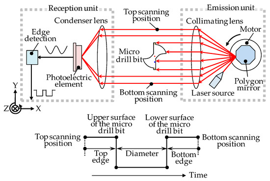 The LSM includes a measurement part and a controller. The principle of the measurement part of the LSM is shown in Figure 3 [19]. A laser beam is reflected by a rotating polygonal mirror to scan within a measurement area. The microdrill bit that has been placed into the measurement area interrupts the laser beam, and cuts the measurement area into three measurement segments, which are referred to as the top edge segment, the diameter segment, and the bottom edge segment. The top edge segment is the distance from the top scanning position to the upper surface of the microdrill. The diameter segment is the distance between the upper surface and the lower surface of the microdrill bit. The bottom edge segment is the distance from the bottom scanning position to the lower surface of the microdrill bit. The laser beams within the top edge segment and the bottom edge segment are focused by a condenser lens, and then received by a photoelectric element, while the laser beam within the diameter segment is blocked by the microdrill bit. After converting the received signal of the photoelectric element to time domain based on detection, outputs of the top edge segment and the diameter segment, as well as the bottom edge segment in each scanning cycle, can be obtained by utilizing the known scan speed of the LSM.