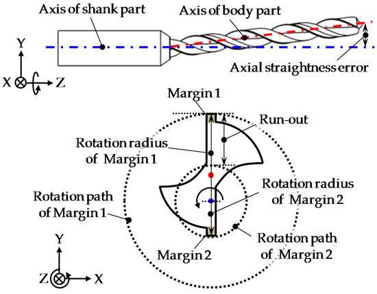 Figure 4 shows the definition of the run-out of the microdrill bit. The axis straightness error between the body part and the shank part of the drill generates different distances from the axis of the shank part to two margins. The distance from the axis of the shank part to each margin is the rotation radius of each margin. When the microdrill bit is rotated, the rotation paths of the two margins are different. The run-out of the microdrill bit is thus defined to be the difference of the rotation paths of the two margins.