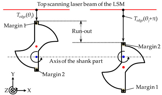 For the measurement of the run-out, the top edge segment of the LSM, which is referred to as TEdge(θ), is employed to measure the two margins. θ represents the angular position of the microdrill bit along its circumference. The measurement principle is shown in Figure 5. The microdrill bit is being rotated by the concentricity gauge, and the measurement output on Margin 1 is referred to as TEdge(θj), in which TEdge(θj) is the minimum measurement output of the top edge segment in the first half of the rotation of the microdrill bit. j is the sampling interval in the circumference direction. Hence, the measurement output on Margin 2 is referred to as TEdge(θj + π). Based on the definition, the run-out, which is the absolute value of the output difference on the two margins, can then be calculated as: