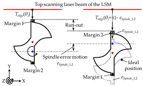 On the other hand, the spindle error motion of the concentricity gauge changes the height position (Y-direction) of the microdrill bit. This process is shown in Figure 6, in which the spindle error motion is t referred to as eSpindle_1,2. Then, the run-out influenced by eSpindle_1,2 can be written as: