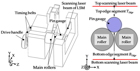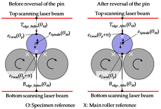 A schematic of the spindle error motion measurement of the concentricity gauge by using the LSM is shown in Figure 7. The spindle error motion is referred to as eSpindle(θM). θM represents the angular position of the main rollers along its circumference, which is provided by the attached scale on the drive handle. A pin gauge with a small diameter is used as the measurement artifact. It is rotationally supported by the concentricity gauge. The upper surface and the lower surface of the pin gauge are simultaneously measured by the top edge segment and the bottom edge segment of the LSM, in which the top edge segment and the bottom edge segment are denoted as TEdge and BEdge, respectively. The spindle error motion of the concentricity gauge is measured before and after a 180-degree reversal operation of the pin gauge, as shown in Figure 8. Before the reversal operation of the pin gauge, the pin gauge is driven by the two main rollers, and the outputs of the top edge segment TEdge_Before and the bottom edge segment BEdge_Before are respectively expressed as: