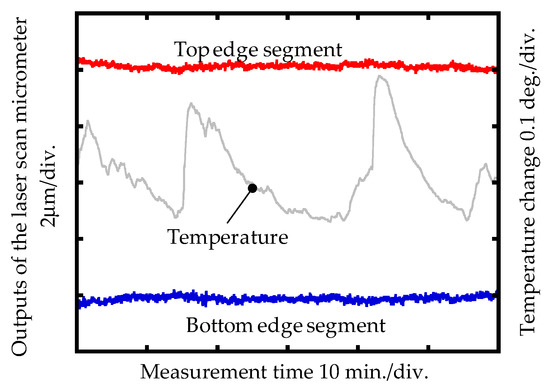 The stabilities of the LSM measurement system were firstly investigated. The temperature during the measurement was measured as well by using a thermal sensor with a resolution of 0.001 °C. In the measurement of the stabilities, the LSM was set by using the moving average method, with averaging points of 512 to reduce the noise level. The measurement interval and the measurement resolution of the LSM were 0.64 s and 0.01 μm, respectively. The measurement of the stabilities lasted for one hour, while all of the parts of the LSM measurement system were kept stationary. The measurement result is shown in Figure 10. The peak-to-valley (PV) stabilities of the top edge segment and the bottom edge segment were evaluated as 0.57 μm and 0.65 μm, respectively, while the temperature drift during the measurement was characterized as 0.269 °C (PV). The stabilities of the measurement system were influenced by the mechanical stability between the concentricity gauge and the LSM, the drift of the scanning beam of the LSM, the temperature drift during the measurement procedure, etc.
