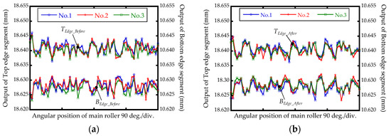 eSpindle(θM) of the concentricity gauge was evaluated based on the proposed measurement method, as shown in Figure 8. The concentricity gauge was driven manually, and the angular position was provided by the scale attached to the drive handle. The measurement sampling interval of eSpindle(θM) was 5.625°. The measurement of eSpindle(θM) was repeated by three revolutions, and the measurement outputs of TEdge and BEdge before and after the reversal operation are shown in Figure 11. Based on Equation (7), the measurement results of eSpindle(θM) were calculated, and are shown in Figure 12. The average PV value of eSpindle(θM) of the repeated measurement result was 7.10 μm, and the measurement repeatability was 2.54 μm. The repeatability error was mainly caused by the rotation accuracy of the concentricity gauge, since the concentricity gauge was driven manually. Also, the non-repeatable rotation errors of the two main rollers were also a factor that induced the repeatability error.