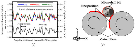 It can be seen from the measurement result that a fine position, which is located from the angular range of approximate 70° to 110°, had the minimum eSpindle(θM), which was 1.86 μm (PV). The fine position corresponds to a 0.111 revolution of the concentricity gauge. Since the diameter of the shank part of the microdrill bit and the diameter of the main rollers are 3 mm and 22 mm, one revolution of the microdrill bit corresponded to 0.136 revolution of the concentricity gauge. The range of the fine position of the concentricity gauge satisfied the required range for the measurement of the run-out of the microdrill bit.