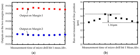 In order to separate eSpindle(θM) out of the concentricity gauge to meet the required measurement accuracy, the microdrill bit was measured at the identified fine position of the concentricity gauge. The microdrill bit was gripped at the beginning of the fine position of the concentricity, as shown in Figure 12b, and rotated one revolution to measure the two margins by the top segment of the LSM. Then, the microdrill bit was rotated back to the beginning of the fine position for the second measurement. This set of measurements was repeated 10 times, and the measurement outputs on the two margins are shown in Figure 13a. The measurement repeatability on Margin 1 and Margin 2 was 0.51 μm and 0.96 μm, respectively. By utilizing Equation (1) and the measurement outputs in Figure 13a, the average of the measured run-out of the microdrill bit was 13.57 μm, with a measurement repeatability of 1.16 μm, as shown in Figure 13b. The standard deviation of the measurement results was 0.40 μm. The repeatability error was mainly caused by the uneven rotational speed and the drift of the scanning beam of the LSM during the measurement.