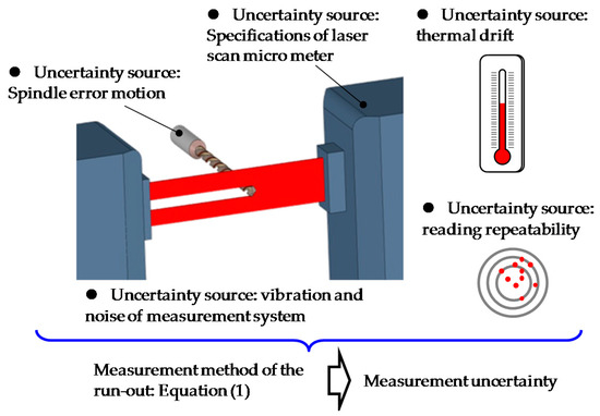 To confirm the reliability of the proposed methods for measurement of the run-out of the microdrill bit, an uncertainty evaluation of the measurement of the run-out was carried out based on Guide to Expression of Uncertainty in Measurement (GUM) [25]. Figure 14 shows a schematic of the uncertainty sources. The measurement uncertainty on each margin was composed of the measurement resolution of the LSM, the linearity of the LSM, the thermal drift, and the mechanical vibration during the measurement. The combined measurement uncertainty of each margin, which is referred to as uMargin, can be evaluated based on the following equation: