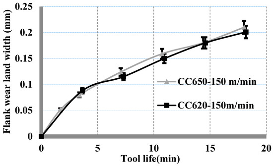 Figure 1 illustrates the wear curves of the used ceramic tools at 150 m/min. The behavior of the curves was almost the same, but tool life was slightly longer using CC620 compared to CC650 (18 min for CC620, 17 min for CC650).