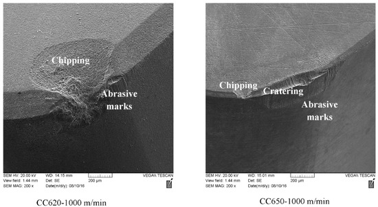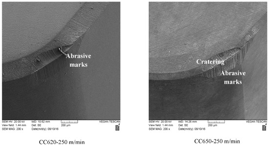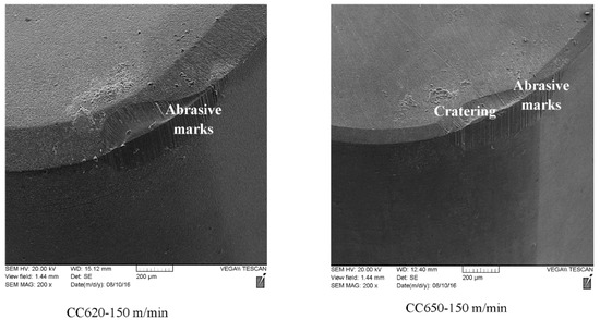 In Figure 2, cratering at the chamfered edge of CC650 was noted, which was not present in CC620. This indicates a higher chemical stability of CC620 compared to CC650 containing 30% of TiC with higher solubility in iron [35]. The abrasive wear mechanism could be deduced from the abrasive marks on the tools flank of each tool.