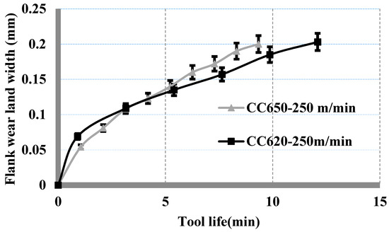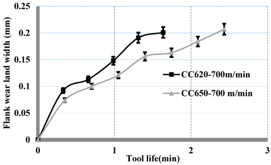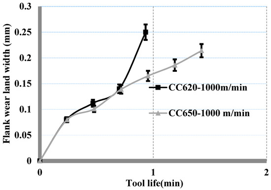 At a cutting speed of 700 m/min, CC650 outperformed CC620 (2.3 min tool life for CC650, 1.6 min tool life for CC620), as presented in Figure 5. As observed before, Figure 6 shows cratering occurred at the chamfered edge of CC650, while this cratering was not present in CC620.