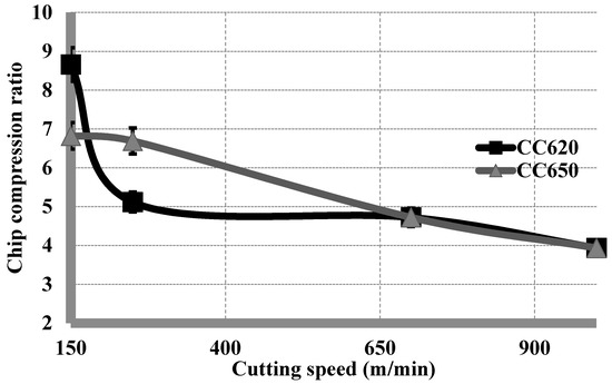 The effect of the cutting speed on the chip compression ratio is presented in Figure 9. At 150 m/min, CC620 had a higher value than CC650 (9 for CC620, 7 for CC650). This is due to the higher hardness of CC650, which affects the tribological behavior at the tool-chip interface. The increase in the hardness of frictional surfaces during dry friction, reduces the value of the resulted coefficient of friction [20]. Upon reaching a cutting speed of 250 m/min, a remarkable decrease of the chip compression ratio value produced by CC620 was observed (from 9 to 5), while the chip compression value for CC650 was 6.7. At 700 and 1000 m/min, the values of the chip compression ratio were the same for the used ceramic tools (4.7 at 700 m/min, 3.9 at 1000 m/min).