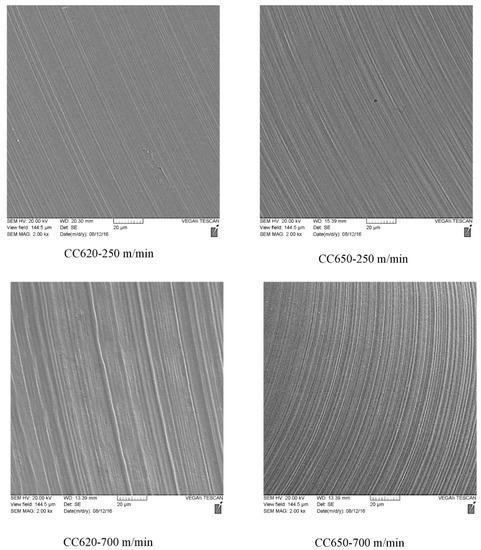 The intensity of the adhesive marks at the chip undersides can be used as an indication of the severity of the adhesive wear mechanism [36]. However, selected chip underside micrographs were presented in Figure 10. At 250 m/min, the intensity of the adhesive marks on the chip underside produced by CC620 was less than the intensity of these marks on the chip underside produced by CC650. At 700 m/min, CC650 produced less intense adhesive marks than CC620. The results deduced from Figure 10 are in agreement with the results obtained from the chip compression ratio curves presented in Figure 9 and the wear curves in Figure 3 and Figure 5.