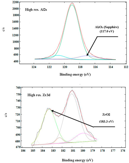 XPS spectra of CC620 at 250 m/min are presented in Figure 11. An adequate amount of alumina (Al2O3) tribo-film with sapphire crystal structure was found (HR Al2s spectrum, binding energy of 117 eV). This tribo-film acts as a thermal barrier at elevated cutting temperatures prevents heat penetration to the tool surface and subsurface that can cause the tool damage; moreover, this tribo-film formation reduces the adhesive wear effect [20]. ZrO2 tribo-film was detected in Figure 11 (HR Zr3d spectrum, binding energy of 183.3 eV). Its formation decreases the coefficient of friction at the tool-chip interface [37]. The detection of these tribo-films supported the results obtained from the wear curve at 250 m/min in Figure 3, chip compression ratio presented in Figure 9, and the chip underside micrographs illustrated in Figure 11. When the cutting speed reaches 700 m/min, ZrO2 tribo-film becomes ineffective due to the expected increase of the cutting temperature to more than 900 °C. This was shown by the wear curve in Figure 5.