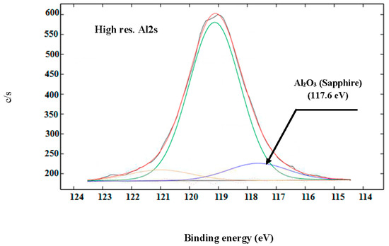 The XPS spectra of CC650 at 700 m/min are shown in Figure 12. An alumina-based layer with sapphire crystal structure was detected (HR Al2s region, binding energy of 117.6 eV). The amount was higher than that found on CC620 at 250 m/min (10.8% compared with 8.3% for CC620 at 250 m/min). This helps the CC650 ceramic tool have longer tool life than CC620 for cutting at this high a speed. Moreover, as indicated in Table 2, CC650 has higher hot hardness and thermal conductivity than CC620, which also enhances its wear resistance.