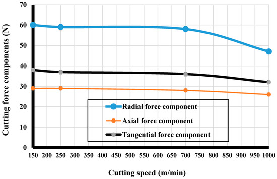 The effect of the cutting speed on the cutting force components when using the CC650 cutting tool is presented in Figure 13. The radial force component was the largest component due to the increased value of the tool nose radius (1.2 mm) when compared to the depth of cut (0.125 mm) [34]. All the components showed a steady behavior with no remarkable reduction in their values until cutting speed reached 700 m/min. By increasing the cutting speed to 1000 m/min, the radial and the tangential force components decreased by 20% and 12%, respectively, which can be attributed to the thermal softening effect. The reduction in the cutting force components and the chip compression ratio upon increasing the cutting speed to 1000 m/min, indicated the decrease of the coefficient of friction at the tool-chip interface when HSM is applied.