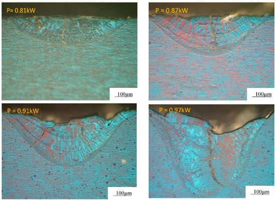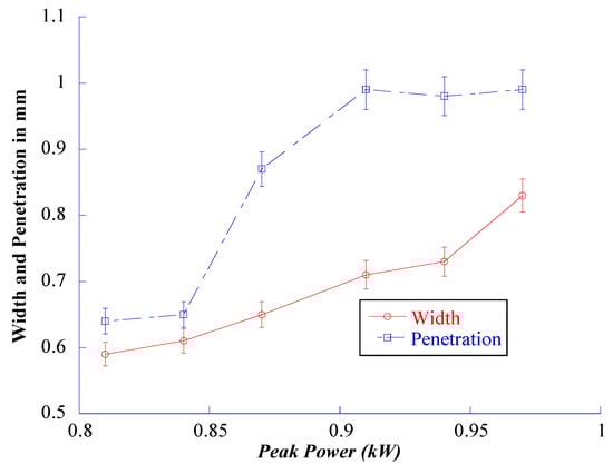 Experimental observation of the weld showed that both the width and depth of the weld area increases with increasing peak power, as can be seen in Figure 1. This change with peak power is more clearly visible in the graph shown in Figure 2. A higher peak power raises the input energy delivered on the weld seam, thus resulting in a comparatively large amount of vaporized or melted metal. By careful observation of the weld seam cross-section, it is clear that near full penetration occurred within the laser peak power range of 0.91–0.97 kW at a welding speed of 2 mm/s; sputtering was observed at a laser peak of 0.97 kW.