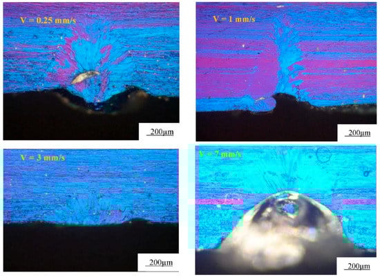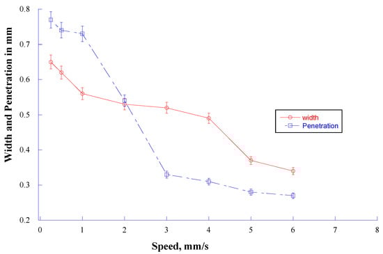 Figure 3 shows how the shape of the weld changes as the laser speed increases. It was observed that the welding depth and width decrease with increasing laser speed, as clearly represented in Figure 4. This is because the speed acts in the opposite manner to the input heat, i.e., welding speed is inversely proportional to the input energy per unit weld length delivered on the weld line, reducing the intermixing of the melt. In this case, the depth became shallow and the width became narrower. Spatter occurs at a laser speed of 7 mm/s.