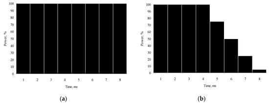 Laser pulse shaping: (a) square pulse shaping; and (b) ramp-down pulse shaping.