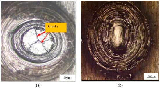The influence of square and ramp-down pulse shaping on laser spot welding were investigated at the optimised peak power and speed. Figure 5a shows a designed square pulse shape consisting of 8 sectors with constant peak power and pulse duration. Figure 5b shows a designed ramp-down pulse shaping consisting of 8 sectors with constant pulse duration, where the peak power is initially at a level high enough to induce melting of the metal surface and subsequently decreases for the remaining pulses. Experimental observation of the spot weld shown in Figure 6a reveals that square pulse shaping induces hot cracking on the weld due to the rapid and uncontrolled cooling rate. No hot cracking was observed on the spot with ramp-down pulse shaping (Figure 6b), because the reduced power level at the end of the pulse sequence provided for a more gradual and controlled cooling rate.