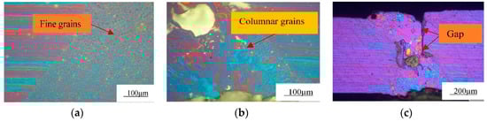 Microstructure of the welded joints: (a) with Al-5Ti-B; (b) with Al-5Mg; and (c) without filler metal.